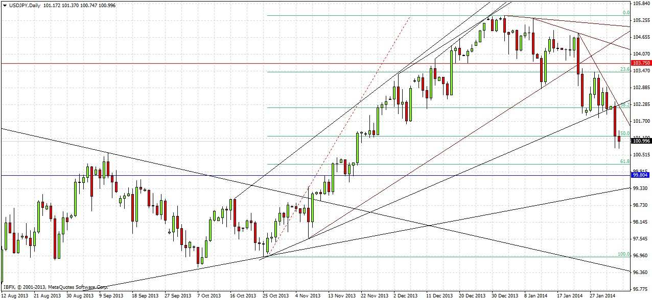 The move down is very strong and is not even holding within a channel formation. We recently passed the 50% Fibonacci retracement level of the upwards move at 101.20, after having retested the broken bullish trend line and falling through resistance at 101.63 quite easily: