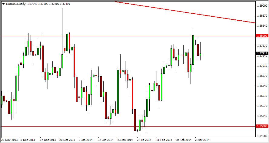 The biggest problem of course is the fact that there is a significant amount of support below, as well as mass confusion. With the problems in the Crimea, the US dollar could very easily get a bit of a bid against the Euro. Because of this, I believe that ultimately this market will continue to grind back and forth, but I am very cognizant of the fact that a move above the 1.39 level would be massive in its implications.