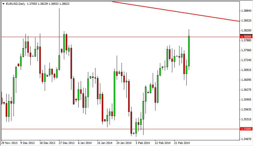 The EUR/USD pair rose during the session on Friday, slamming into the 1.38 resistance level. This area has been the top of the consolidation recently, so of course this has caught my attention. What I find truly interesting is that we are approaching a massive downtrend line that forms the top of a downwards channel. This channel is on the monthly chart, and is a channel that has been in effect since the beginning of the financial crisis. In other words, we are at a massive inflection point in this pair.