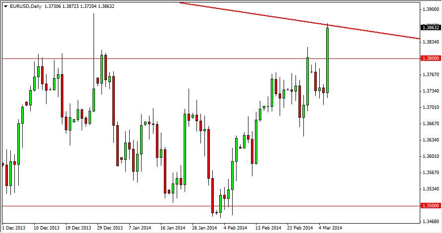 The EUR/USD pair shot straight through the 1.38 level during the session on Thursday, as the European Central Bank suggested that it wasn’t going to do anything to loosen monetary policy anytime soon. Because of this, I feel that the Euro is going to continue to strengthen, but there is one massive bit of resistance to get over first.
