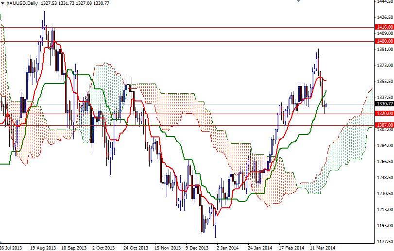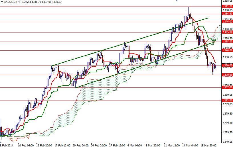 Gold prices continued to decline yesterday and touched the 1320 support level as a stronger dollar reduced the appeal of the precious metal as an alternative investment. The American dollar gained some more momentum across the board after the Labor Department reported initial jobless claims increased slightly and data released from the Federal Reserve Bank of Philadelphia showed that the index measuring manufacturing activity in the region climbed to 9 in March from -6.3 in February.