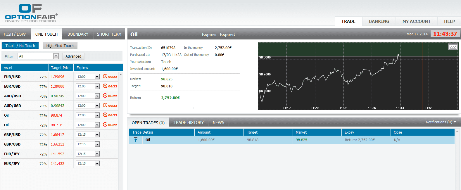 I logged in the OptionFair™ binary options trading platform and I traded $1600 on the “Touch” instrument. This kind of option has a return of 72% if the option touches the strike price prior to expiry, which means that if the signal is correct, I could get a return of $1152 on my investment.