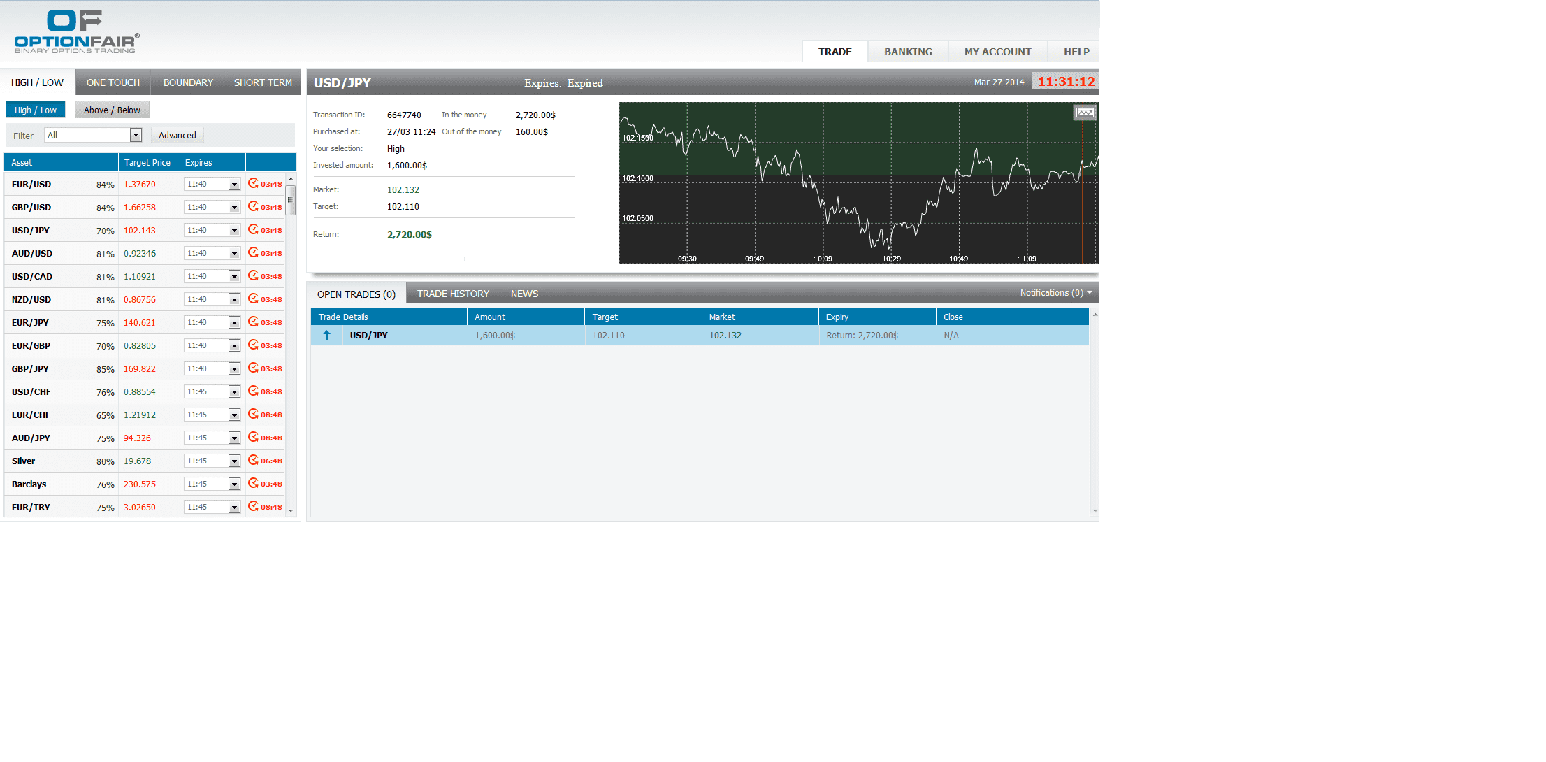I logged in the OptionFair™ binary options trading platform and I traded $1600 on the "High" instrument. This kind of option has a return of 70% if the option will close above the target price, which means that if the signal is correct I could get a return of $1120 on my investment.