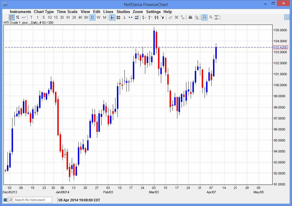 I plan on buying on the pullbacks in this marketplace, and selling simply is not an option. With all of the noise below, it’s going to be far too dangerous to do that, and as a result it’s difficult to imagine that the market is going to break down significantly without a serious fight. I believe that ultimately the market is going to break above the $105 level above, and as a result sooner or later we should see the 110 level, but it will take some time as there is a lot of noise out there in the headlines as well, especially with the Russians and the Ukrainians in a bit of a standoff. Remember, Russia is a major exporter of crude oil, and that of course will have an effect on energy markets in general.