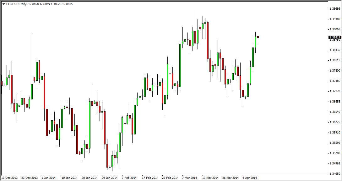 The EUR/USD pair went back and forth during the session on Friday, essentially settling nothing by the time the market closed. The 1.39 level did in fact offer enough resistance to keep the market somewhat lower for much of the session, but this really is an overly surprising considering how parabolic the move has been over the last four sessions previously. With that, it appears of the market will more than likely have to take some type of break going higher, and that makes sense to me as markets never go in one direction forever anyway.