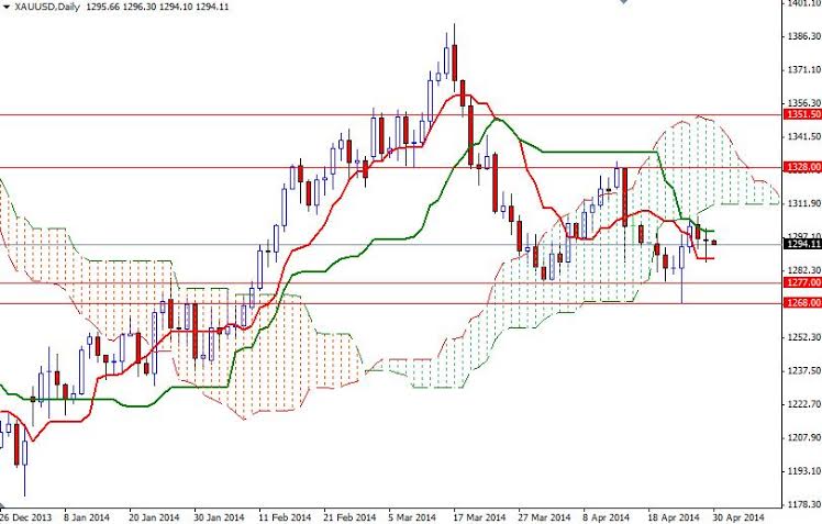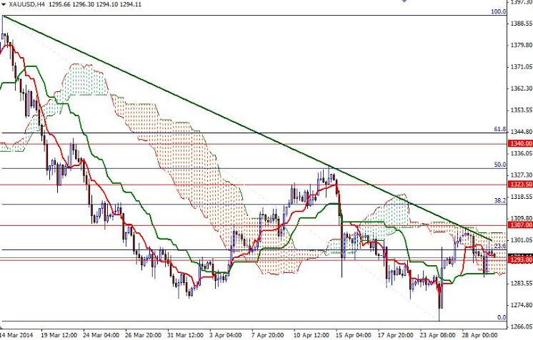 The Fed's policy statement will be issued at the close of its two-day meeting today. It is not only the FOMC that is coming up today; we also have U.S. first-quarter GDP, ADP employment and Chicago PMI data. During the Asian session the XAU/USD pair is hovering just above the 1293 support level but since we are moving inside the Ichimoku cloud on the 4-hour time frame, I will be focusing on the 1307 and 1285 levels.