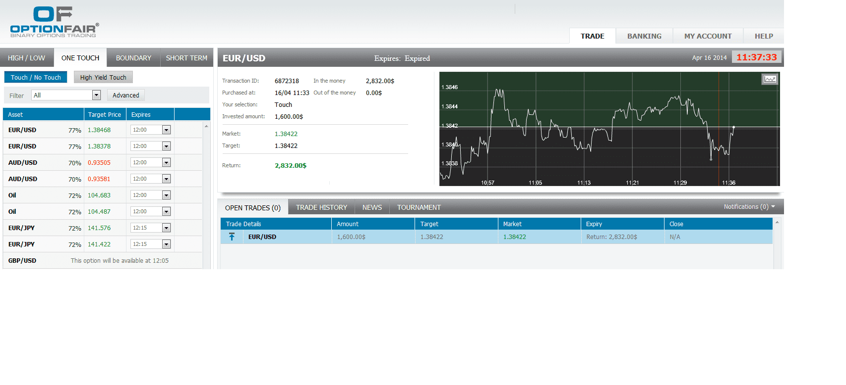 I logged in the OptionFair™ binary options trading platform and I traded $1600 on the “Touch Up” instrument. This kind of option has a return of 77% if the option touches the strike price prior to expiry, which means that if the signal is correct, I could get a return of $1232 on my investment.