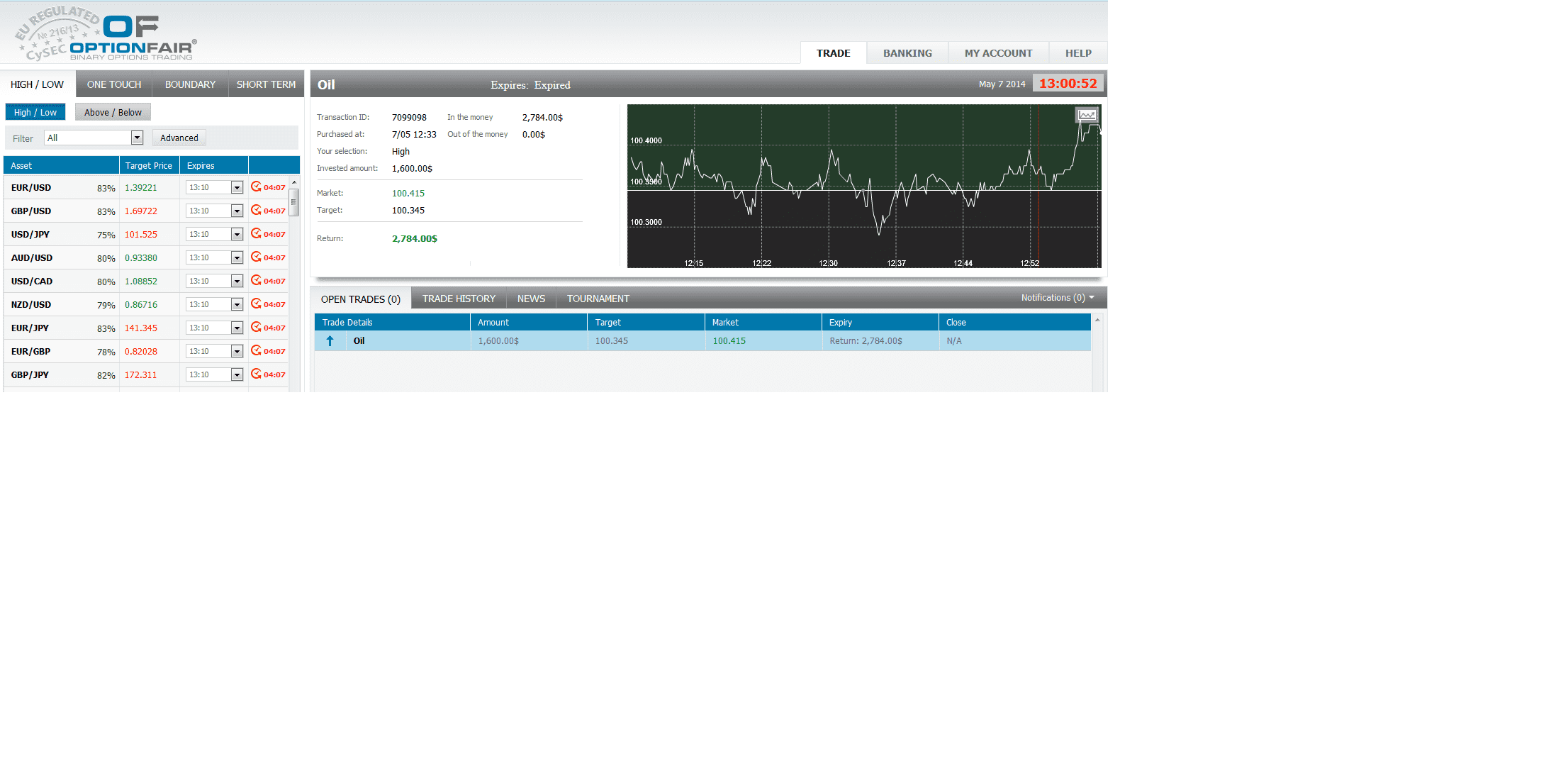 I logged in the OptionFair™ binary options trading platform and I traded $1600 on the "High" instrument. This kind of option has a return of 74% if the option will close above the target price, which means that if the signal is correct I could get a return of $1184 on my investment.