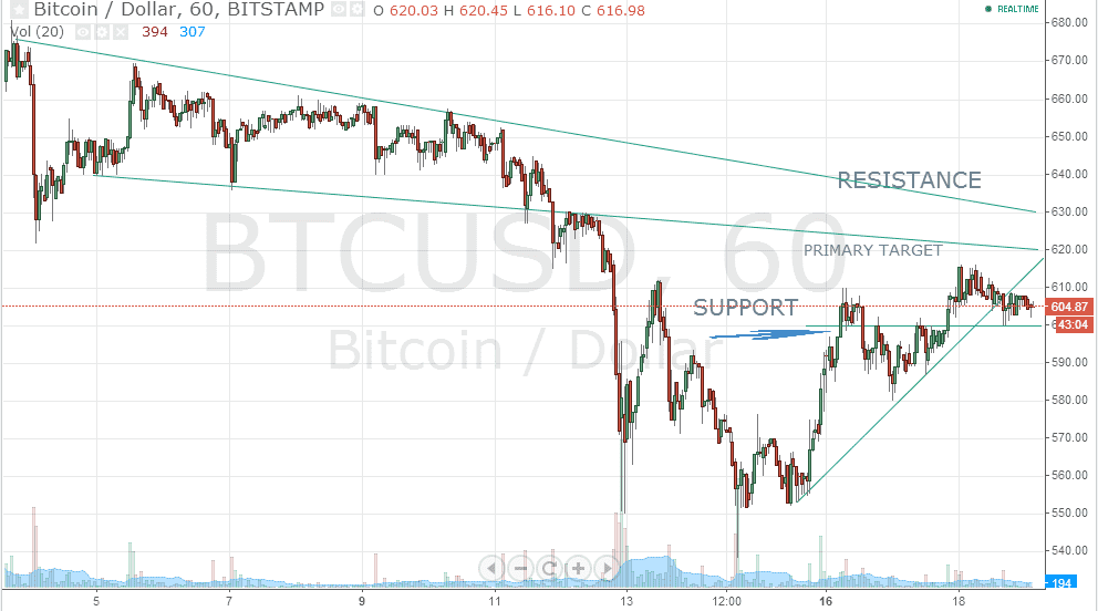 The price of BTC/USD, after having taken out the previous top of 605, failed to maintain its upward momentum and has retraced more than 1% from the high of 615 and has even retested the near-term support of 600. The pair is facing bouts of profit-booking at higher levels and is currently consolidating after breaking down from the upward sloping trend line (marked in the hourly chart).