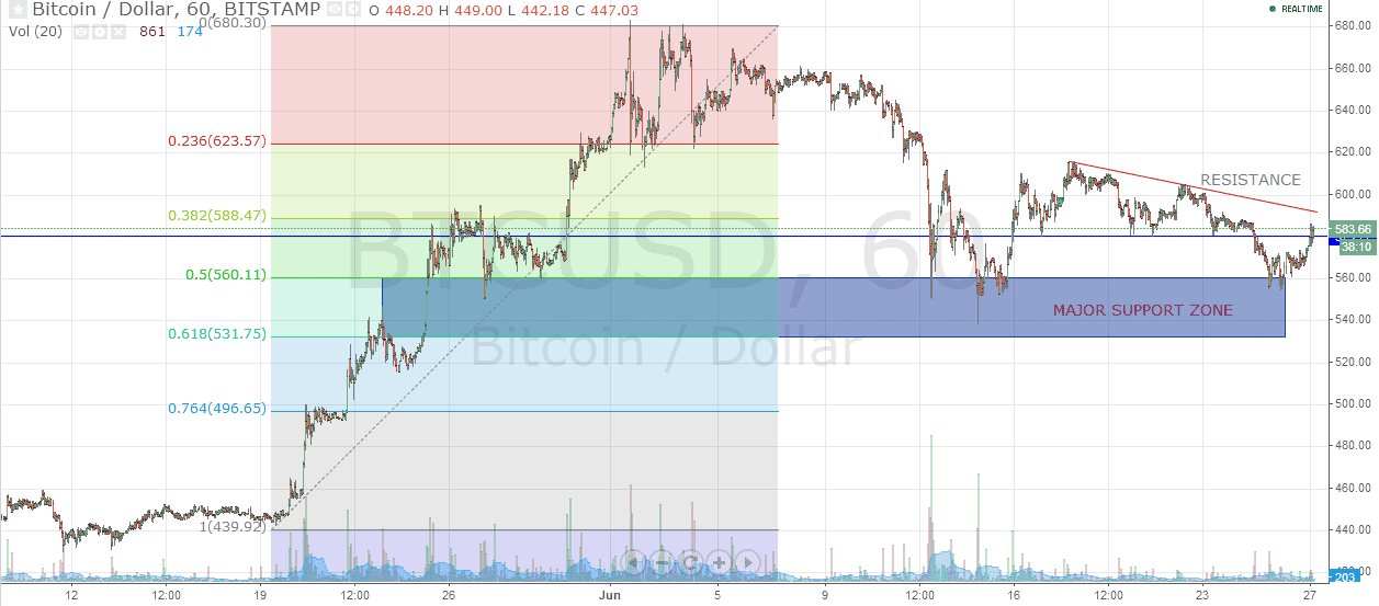 Bitcoin is currently trading near its previous support level of 580 which is just at around 2-3% below the resistance level of 595. The price action of Bitcoin suggests that a big move is around, and that the Bitcoin auction to be held today can play a direction-defining role. While the Fibonacci retracements levels of 61.8% and 50% have acted as a major support in the past (marked above), the levels of 600-610 have acted as a major hindrance to the upward momentum. A close beyond either of the levels would accurately define the direction and fresh positions should be made accordingly.