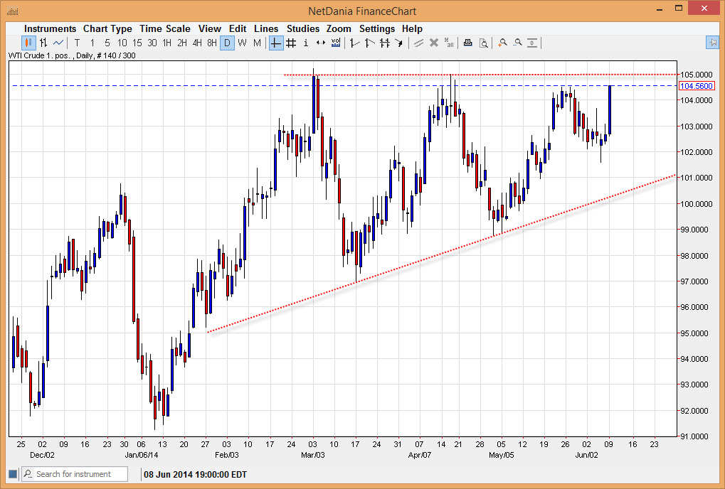 The WTI Crude Oil markets had a very strong showing during the session on Monday, but remains below the $105 level. The area between the $104.50 level and the $105 level should continue to be resistive, but ultimately I believe that the $105 level will get broken to the upside. When you look at the chart on the daily timeframe, there is an obvious ascending triangle that I have marked on the chart, which measures for a move to the $113 level. With this, the market looks very bullish as far as I can tell, and any pullback at this point time should invite more buyers. I think ultimately we will reach the $113 level, but is going to take some time as per usual.