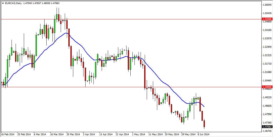 The EUR/CAD pair fell again during the session on Wednesday, breaking to a fresh, new low. I mentioned this pair the other day, and we have in fact made that fresh new low that I needed to see in order to start selling with any type of long-term intentions. The 1.47 level is offering a little bit of support at the end of the day, but ultimately I think that this market continues much lower. Certainly we are in a downtrend and it appears that the 20 day moving average is been quite respected by traders in this market.