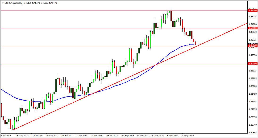 The EUR/CAD pair is one that I believe will be fairly interesting during the month of July. After all, on the weekly chart attached to this article, you can see that the 52 week moving average is sitting just below the candle for the end of June. Also, there is a significant uptrend line that seems to dissect the 1.45 level. With this, we could see a significant amount of support come back into the marketplace, and send this market higher.