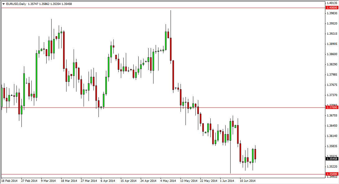 The EUR/USD pair fell during the course of the session on Tuesday, but still remains above the 1.35 support level. Because of this, I don’t necessarily think that we are breaking down quite yet, rather we are simply going sideways at a massive support zone. However, do not think that I am not wanting the 1.35 level very closely. Quite the contrary to that, I believe that this level will determine what happens for the rest of the summer in the Euro.