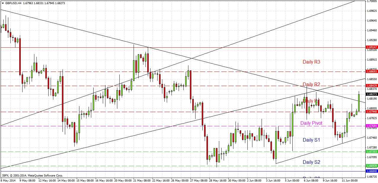 As I write the price is breaking out bullishly from the triangle, which can be seen in the chart below. If it holds up this will be a bullish sign, however note that there is the old broken bullish trend line ahead which is likely to act as resistance, at least before the New York session. There are no major news releases due before the New York session so it likely nothing dramatic will happen before then. However if the USD-related news is bad for the USD, it is possible that we may spike up to 1.6914 which should give an excellent short touch trade.