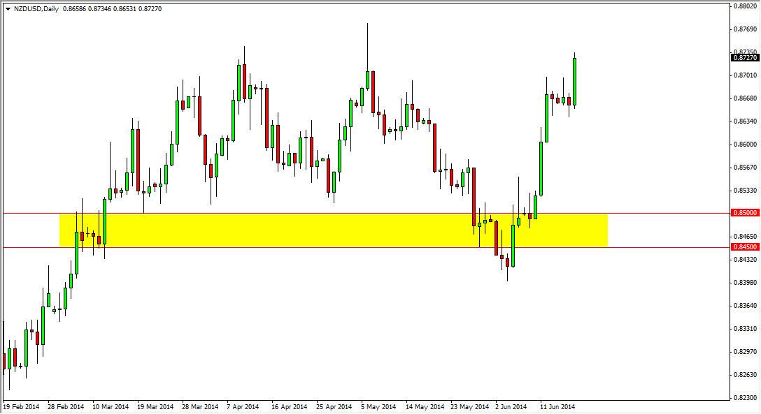 The NZD/USD pair broke higher during the session on Wednesday, breaking above the recent and extraordinarily tight consolidation area that we have been in. This represents real strength reentering the market, and that means that we should ultimately breakout above the 0.8750 level. Pullbacks on short-term charts should continue to be buying opportunities, and as a result I believe that watching the short-term charts will be the way to go going forward. Ultimately, I do believe that we go higher and will eventually try to get to the 0.90 handle, an area that is significant on the longer-term charts.