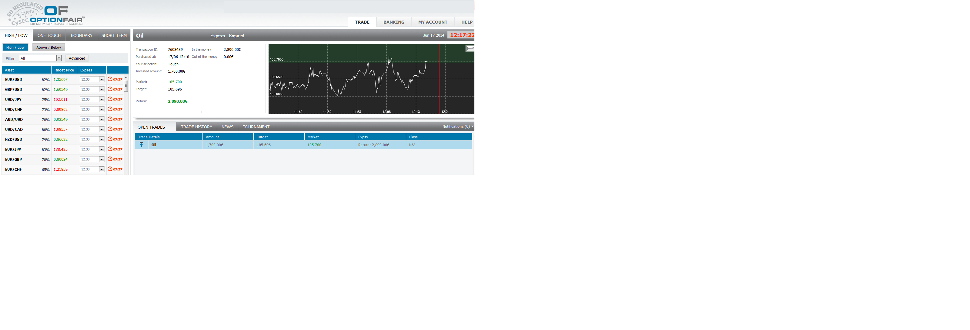 With optionFair™ binary options trading platform, I traded $1700 on the “Touch” instrument. This kind of option has a return of 70% if the option touches the strike price prior to expiry, which means that if the signal is correct, I could get a return of $1190 on my investment.