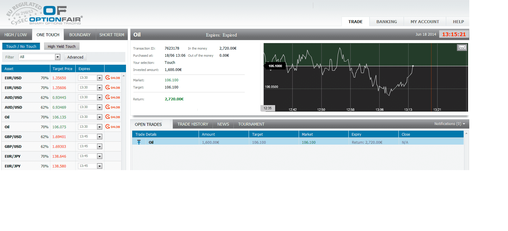 With OptionFair™ binary options trading platform, I traded $1600 on the “Touch” instrument. This kind of option has a return of 70% if the option touches the strike price prior to expiry, which means that if the signal is correct, I could get a return of $1120 on my investment.