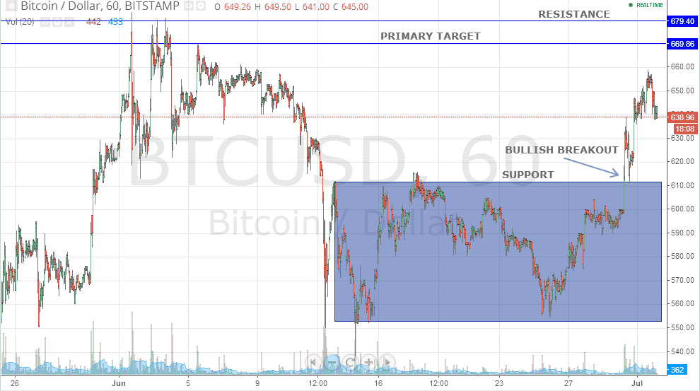 As can be seen from the hourly BTC/USD chart, there has been some considerable profit taking after the price moves past the 650 mark. After registering a bullish breakout at around 610, the price of Bitcoin leapt towards 658 on strong fundamental support, with a flurry of positive announcements and auctions supporting the long-term viability of the digital currency. Since then, BTC/USD has been facing profit taking which dragged the price below 640. Bitcoin is currently trading just shy of 640 at 638.96. The primary target of the digital currency lies at 670 whereas all long positions must definitely be closed near the strong resistance level of 680 (as per chart).