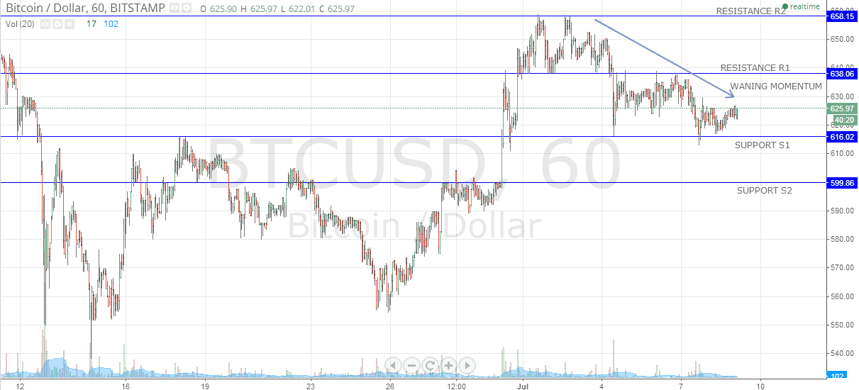 BTC/USD has formed a lower-top lower-bottom structure with no signs of a trend reversal as of yet. The momentum has clearly weakened and the price is expected to continue to drift lower. It has become highly probable that owing to a lack of major triggers, levels of 600 may be seen in the next couple of trading sessions.