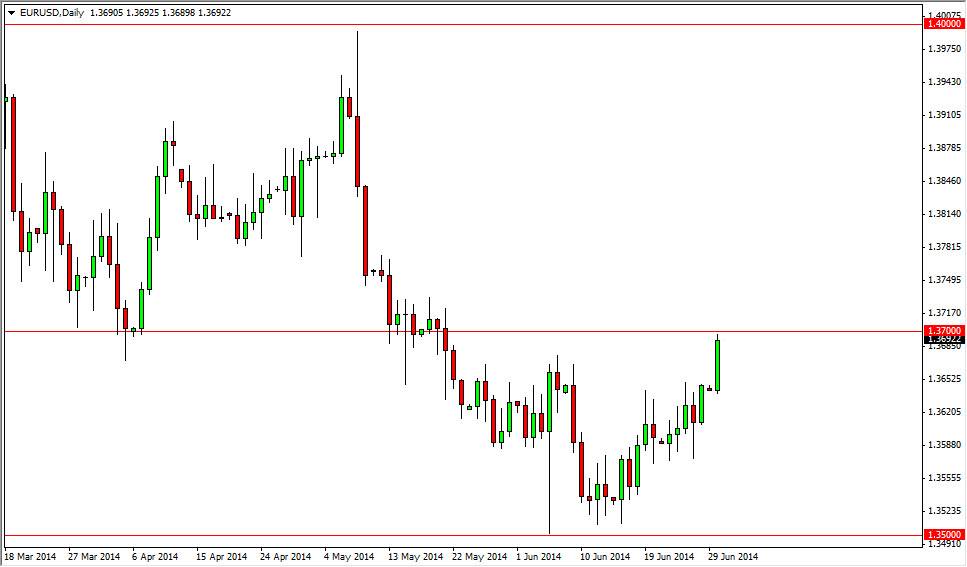 The EUR/USD pair had a very strong showing on Monday, testing the 1.37 level for resistance. We did in fact find support up there, and it does not surprise me that we stopped just below that area. This area has been significant resistance lately, and as a result I think that is going to be fairly difficult to get above this area in the short-term. In fact, I am not ready to start buying until we clear the 1.3750 level, which I feel is the top of the “zone” that we are currently fighting against.