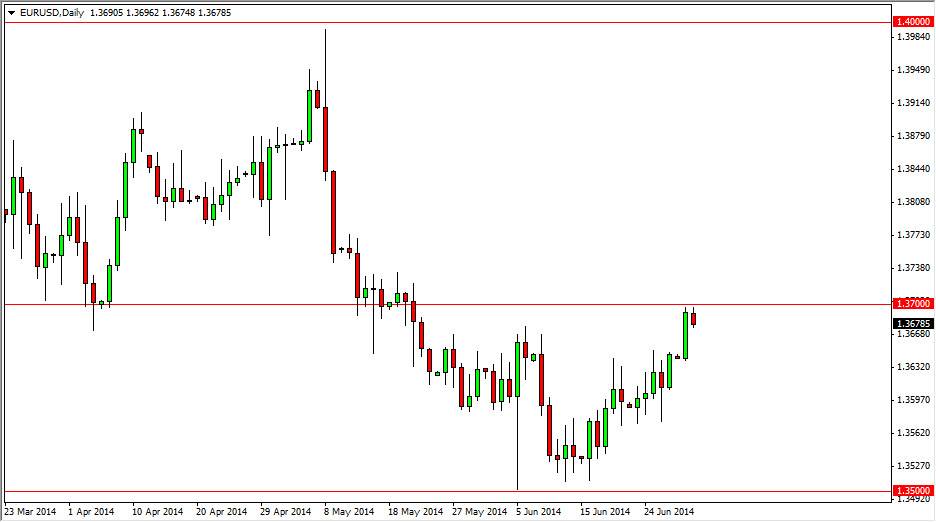 The EUR/USD pair fell from the 1.37 level during the session on Tuesday, an area that has been both support and resistance previously. With this, it appears that the market did in fact chew through some resistance during the day, but did not get above the actual resistance zone. I believe that the “zone” extends all the way to the 1.3750 level, and as a result I am not ready to start buying yet. In fact, I find it difficult to imagine that this market is going to continue going higher until we yet the nonfarm payroll numbers on Thursday.
