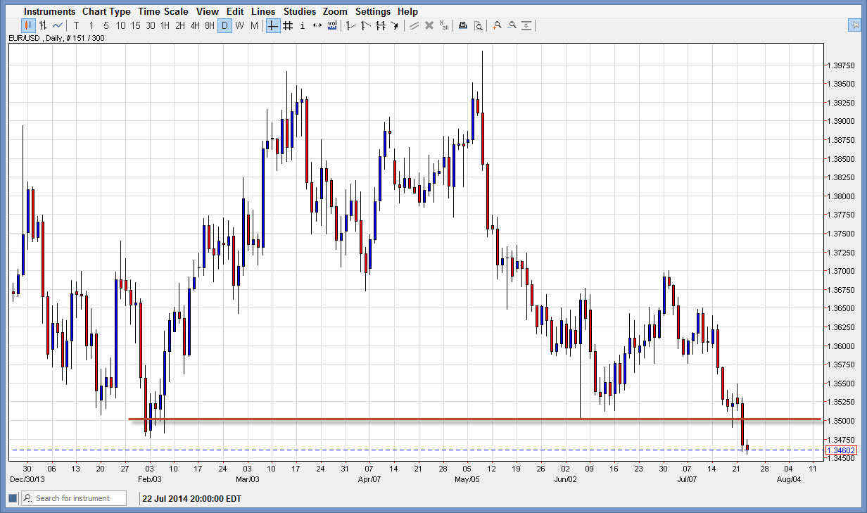 The EUR/USD pair continued its negative tone during the session on Wednesday after we had broken below the 1.35 level on Tuesday. With that being the case, the market looks like it’s ready to continue going lower, but with the tight range that we had seen during the Wednesday session, a bounce is certainly possible. With that being the case, I think that the 1.35 level will of course continue to be an area that should bring in sellers and as a result of that I would be more than willing to start selling a resistant candle in that region. Ultimately though, we could continue to go lower, which of course is an even more aggressive signal.
