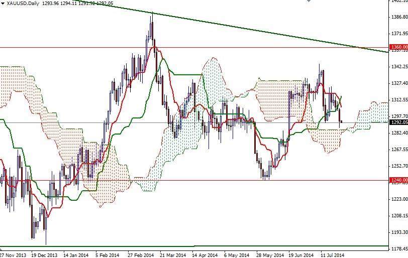 The precious metal has been struggling lately but investors still keep a wary eye on the developments in the Middle East and Ukraine to see if things will escalate or simmer down. Today, I will be watching the 1297 and 1286 levels. We have bearish Tenkan-sen (nine-period moving average, red line) - Kijun-sen (twenty six-day moving average, green line) crosses on the daily and 4-hour charts. Although both charts suggest there is a chance we will see the pair trading lower, I think the 1286/1283.30 area -where the Ichimoku cloud on the daily chart and a previous support level coincide- holds the key to the down side.