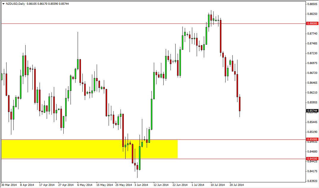 I believe that we will finally break out sometime later this summer, or perhaps once the fall season starts, as traders the macro holiday. Nonetheless, I am not interested in shorting this market unless we get below the 0.84 handle, which would show a complete smashing of support, and thereby making me believe that the trend is falling apart for the buyers, and that we will see quite a bit of creative destruction. However, I really don’t think that we are going to break down below that area, so therefore I am simply looking for an opportunity to take advantage of a cheap Kiwi dollar.