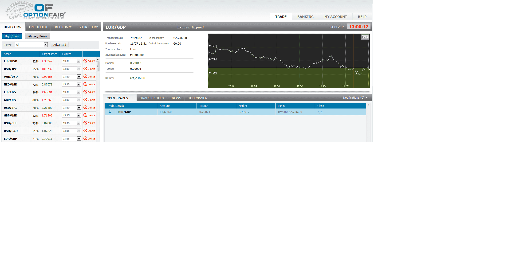 The market price for EUR/GBP at the buying time (12:51) was 0.79024 for the expiration of 13:00. The Asset closed on 0.79017 and I made $1136.