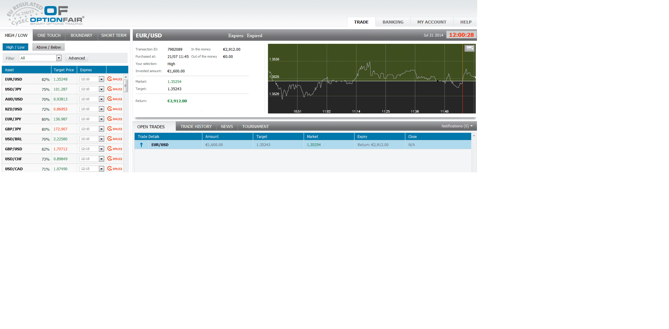 I logged in the OptionFair™ binary options trading platform and I traded $1600 on the “High” instrument. This kind of option has a return of 82% if the option touches the strike price prior to expiry, which means that if the signal is correct, I could get a return of $1312 on my investment.