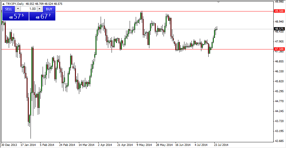 You can see that I have two lines clearly marked on the chart. Think of this as two trenches on a battlefield. You essentially have buyers and sellers doing battle with each other, and somewhere in the middle is why it would be considered “fair value.” In other words, it’s where the market thinks that the currency pair should be at the moment. However, you can’t really take a trading that general vicinity because it’s a very good way to lose money. Essentially it’s a 50-50 chance that the market goes your direction. With that, I’m very hesitant to put trading capital to work at this point. However, if we can pull back to the 47.50 level, I think that the buyers will step back in and push this market higher. That’s the type of setup I’m looking for in order to go along of the Turkish lira again. In the meantime, I’m simply waiting for some type of supportive candle near that region. Alternately though, if we broke above the 49.50 level, I would be willing to buy as well because it would of course be a breakout of a significant consolidation area.