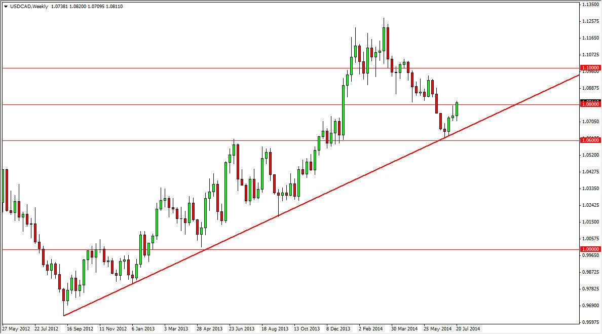 The USD/CAD pair has bounced off of an uptrend line during the month of July, at a particularly important spot on the chart. Because of this, I believe that the uptrend continues, and that more than likely we will in fact see the Canadian dollar sell off going into the month of August, and probably for the longer term as well. After all, the uptrend line has been valid since late summer of 2012. I know it’s a bit odd to think that this pair has been in an uptrend for that long, simply because it’s been fairly quiet for most of that time.