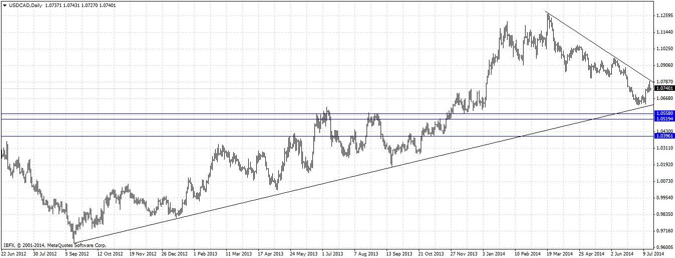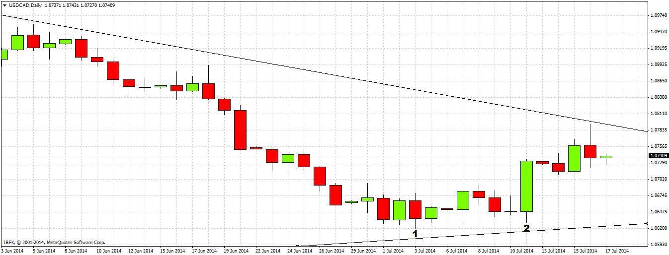 There is one problem of course: going back to the first chart posted above, there is also a bearish trend line with a second recent touch above us. It might be that this trend line will hold for a while and push the price back down below 1.07. However it will most probably break, causing a powerful triangle breakout, but it may take a few days for this to happen.