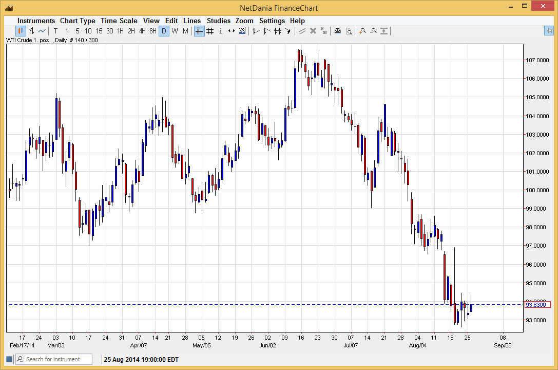 This is a market that at best can be described as dangerous. After all, you can see that the moves have been very violent, as the candle from last week when all the way to the $97.00 level and turned completely around to close near $93.00 level by the end of the day. That shows how volatile and dangerous these markets can be, and the fact that we are in the last week of August certainly will not help as far as liquidity is concerned. With that in mind, I am very hesitant to jump directly into this market, and will be using options to express my opinion. Right now, I really don’t have one as I believe the market isn’t ready to go anywhere in the near term. With that, I have my eye on the market, but am not ready to make a move yet.