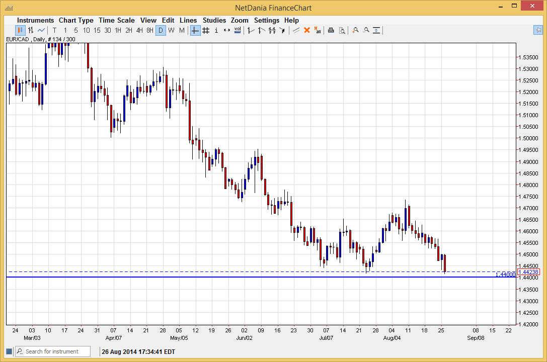 I believe that you simply cannot fight a trend that’s this strong, and obviously the Euro is in significant trouble. While the Canadian dollar hasn’t exactly shined either, there are no concerns about loosening the monetary policy coming out of the Bank of Canada. On the other hand, it’s obvious that the European Central Bank is going to have to loosen monetary policy to fight potential deflation in the European Union. We are even seeing potential signs of deflation out of Germany of all places, and that certainly must have the Europeans concerned. All things being equal, I think this will be one of those “dark horses” as far as trades go, as most people will not pay attention to it but creates a clear and definitive trend.