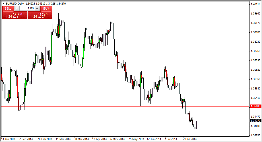 The Euro got a bit of a reprieve on Friday after a somewhat disappointing nonfarm payrolls number out of United States. During the month of July, the United States added about 25,000 less jobs than anticipated, therefore the US dollar sold off a little bit. At the end of the day though, I believe that the Euro was just oversold to begin with and as a result this was a move that you shouldn’t read too much into. In fact, I’m still very bearish, but recognize that we may need to continue going higher, perhaps as high as 1.35 where I see selling quickly entering into the marketplace.