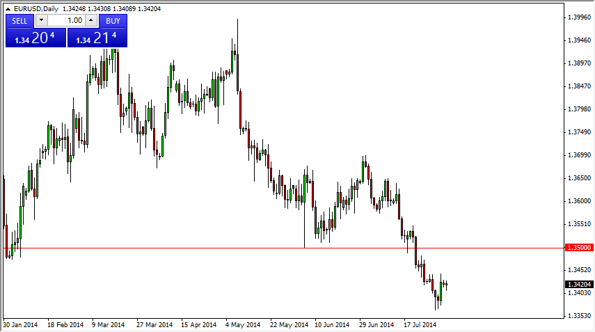 The 1.35 level in my opinion is an excellent selling opportunity, but I will have to see the right candle, such as a shooting star or engulfing negative candle. In the meantime, the range for the Monday session tells me that we are probably going to continue to be tight in the short term, but that’s okay as the summer time dictates that type of trading anyway, and I tend to avoid it at all costs as it simply isn’t worth the hassle.