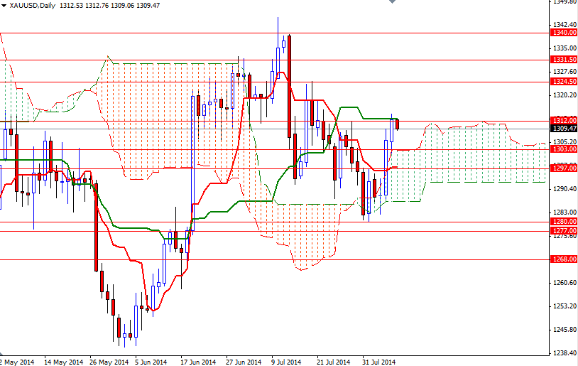 As I mentioned in yesterday's analysis, trading above the Ichimoku clouds on both the daily and 4-hour charts gives the bulls an advantage. Technical outlook suggests that there is more strength and volume behind the bulls at the moment. So until the market drops back below the clouds and we have a bearish Tenkan-Sen (nine-period moving average, red line) - Kijun-Sen (twenty six-day moving average, green line) cross, there will not be any real reason to sell. In the meantime, the key levels to watch will be 1312 and 1303. I think the pair has to push its way through the 1312/1312.64 area in order to start a journey towards the 1324.50 level. On its way up, expect to see some resistance at 1318. To the down side, there is an interim support between 1307 and 1303. Below that, an important challenge will be waiting the bears at 1297.