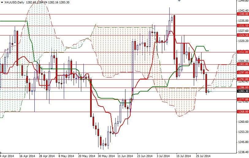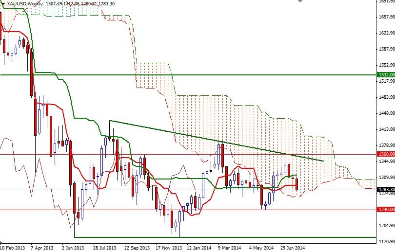 Looking at the charts from a technical perspective, I still think that the descending triangle forming on the weekly chart will contain the market for the next several weeks. Yesterday's price action dragged the XAU/USD pair back below the Ichimoku cloud on the daily time frame and I think that is something to pay close attention. Bearish Tenkan-sen (nine-period moving average, red line) - Kijun-sen (twenty six-day moving average, green line) crosses on both the daily and 4-hour charts are increasing the pressure on prices but in order to reach the 1240 level, the bears will have to capture the strategic supports at 1277 and 1268 (where the bottom of the cloud sits on the weekly chart). To the upside, there will be resistances such as 1292, 1303 and 1312. Only a close above the 1312 level on a weekly basis could shift things to the bulls once again and lure more buyers (targeting the 1324.50 level at least) into the market.