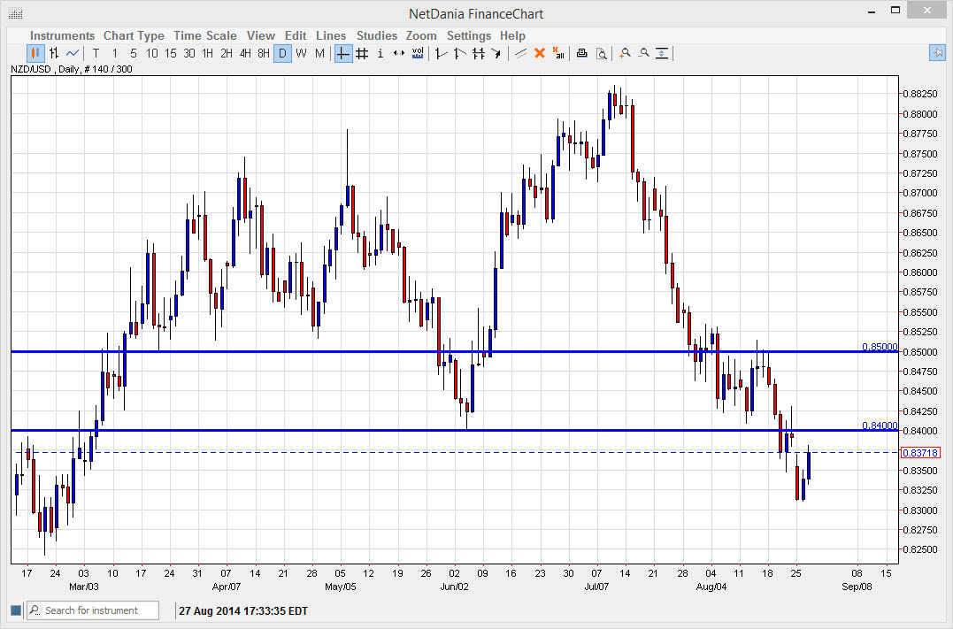 I do not have the resistive candle to sell quite yet, but it’s only a matter of time as far as I can see. The fact that we have a shooting star that is based on the 0.84 level, and as a result I believe that the selling pressure will continue to appear there. This being the case, I feel that the market is one that you cannot buy right now, because there are far too many things that can happen as far as I see causing the market to fall. In fact, there are a lot of potential geopolitical headlines that could have people buying the US dollar. Certainly, the problems in the Middle East and the Ukraine could have the markets flare up in a “risk off” type of situation at any moment.