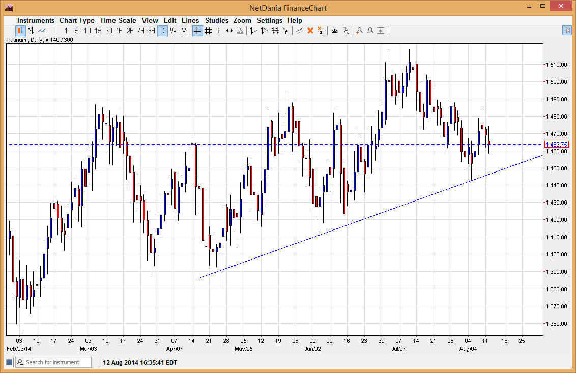 The platinum markets gapped lower at the open on Tuesday, and then turned back around to fill that very same gap. The fact that we fell down from that area and formed a shooting star suggests that the market is probably going to weaken from here as well, but ultimately I feel that the trend line on the chart suggests that the $1450 level is about as low as the platinum market is ready to go. With that, I am looking for a supportive candle in that region.