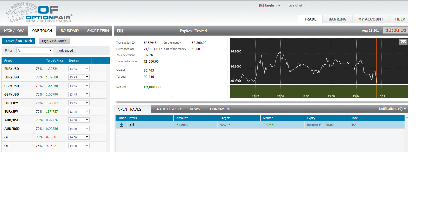 I logged in the OptionFair™ binary options trading platform and I traded $1600 on the "Touch Down" instrument. This kind of option has a return of 75% if the option touches the strike price prior to expiry, which means that if the signal is correct, I could get a return of $1200 on my investment.