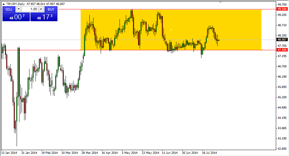 This is one of my favorite carry trade pairs, as the Turkish lira offers a large interests payment at the end of the day. Quite frankly, as long as we remain range bound, I see no reason whatsoever to short despair, as simply collecting the interest at the end of the day is one of the best ways to invest in the currency markets with the exotic pairs such as the Turkish lira versus the Japanese yen.