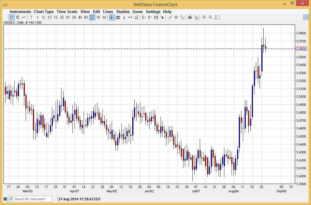 I believe that part of this is based upon the problems with the Gaza Strip, but ultimately I think that it’s only a matter of time before money floods back into Israel. After all, it is a higher-yielding economy, and even though the Israeli central bank recently has cut interest rates, there is still the possibility of appreciation buying the Shekel over the Dollar.