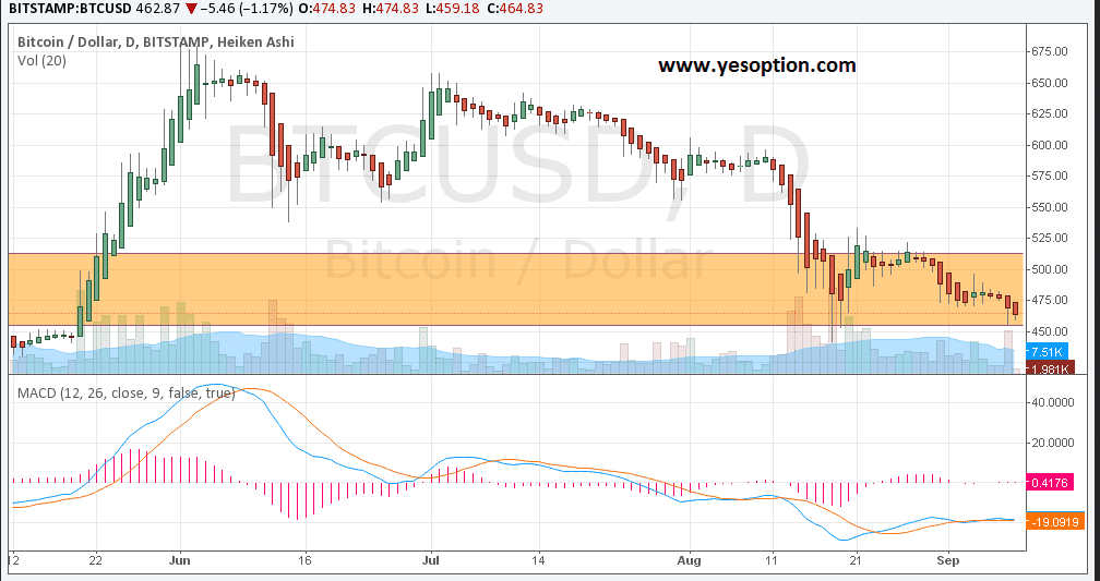 Sell BTC/USD below $455 for a target of $440, $420 with a stop loss of $463