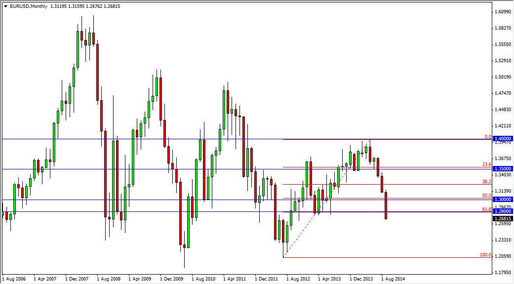 The EUR/USD pair fell hard during the course of the month of September, slicing through 1.28 with absolutely no trouble whatsoever. Because of this, I think that this market continues to fall and I even believe we go as low as roughly 1.20 level given enough time. With that, I am selling rallies as they appear, as this market is completely broken. The fact that we are closing towards the end of the month at the very lows of the candle tells me that the market certainly has a lot of negative connotations to it, as the US Dollar has become one of the few games in town.