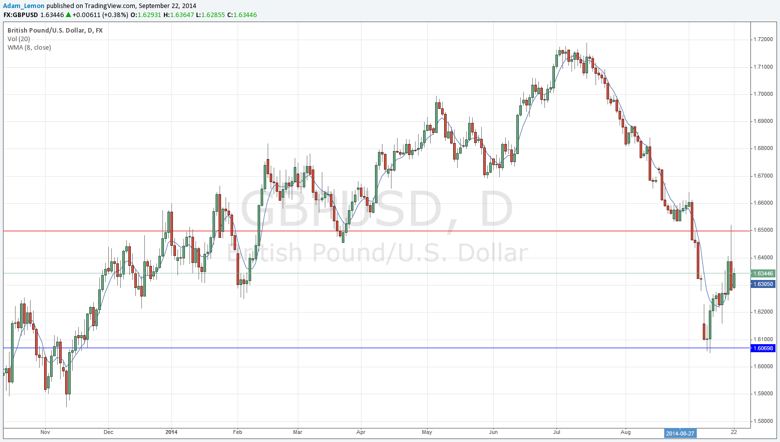 My last analysis was made on the day of the Scottish independence referendum last week. I predicted that the GBP would rise dramatically as soon as it became likely that the result was positive for remaining in the UK, but would fall even more dramatically if it seemed like that the result would be in favour of going independent. I recommended trading this pair for a pro-independence vote, as the USD is so strong, and trading GBP/JPY for a vote in favour of the status quo, as the JPY was so weak.