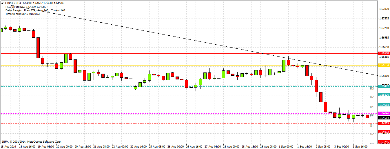 Yesterday was a quiet day after Tuesday's strong fall. The tendency is still bearish and we are in a strongly bearish trend. The GBP is proving to be one of the best currencies to short against the recent Usd strength. The GBP's weakness is being exacerbated somewhat by the increasing likelihood that Scotland will vote for independence in the referendu scheduled for the 18th of September.