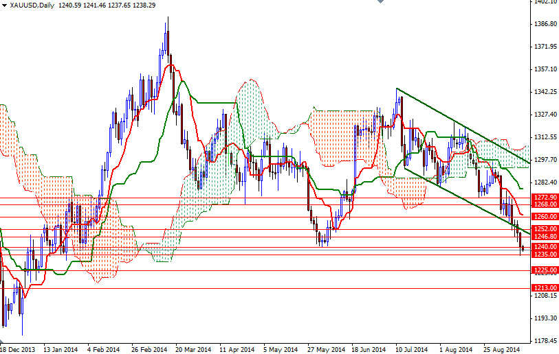 The XAU/USD pair continued to sink during yesterday's session and touched its lowest level since January 23 as the American dollar maintained its strength across the board on growing conviction that the U.S. Federal Reserve will begin altering its monetary policy sooner than previously thought. The bears have been dominant since prices touched the $1344.92 level in July. Although there are some uncertainties which would generally drive gold prices higher, the market is focusing much on the fact that the U.S. economy is steadily improving. In addition (to the dollar's strength), persistent uptrend in stock markets is making gold less popular.